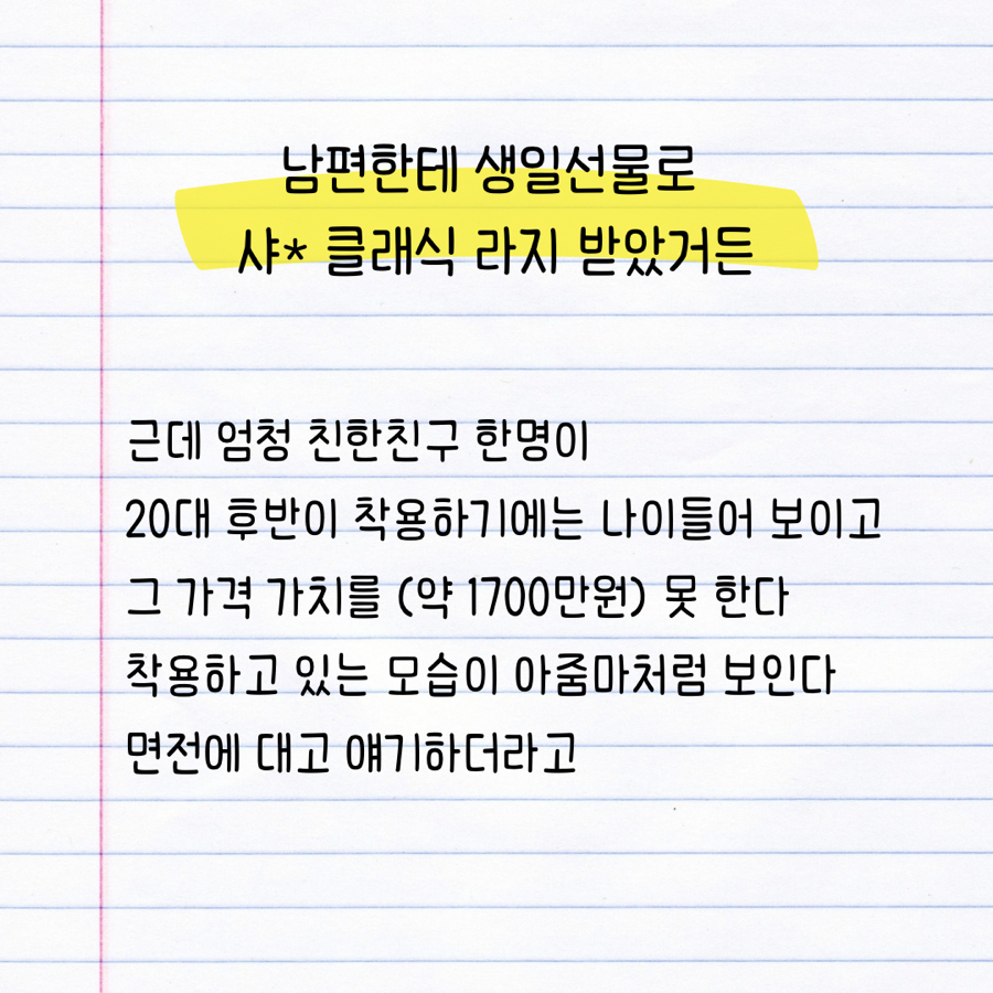 글쓴이는 20대 후반으로 남편에게 샤* 클래식 라지를 선물로 받았대요. 남편 능력이 상당한거 같은데요. 친구들 모인 자리에서 보여달라는 친구들의 말에 가방을 보여줬다고 해요. 그런데 그중에서 정말 친한 친구 한 명이 “우리 나이에 너무 올드하다”, “1700만원 주고 저건 좀 아닌 것 같다”, “너 아줌마 된 거 같다”는 말을 했다고 하네요.