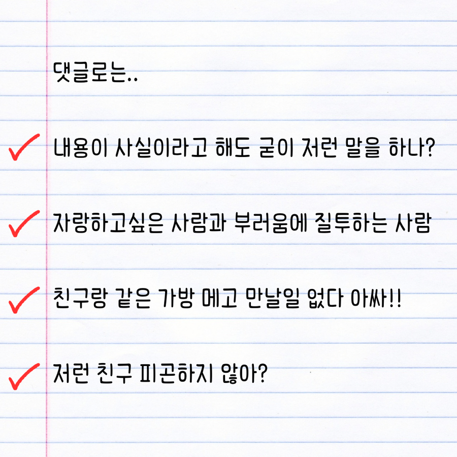 나도 가끔 내 취향이나 선택을 누가 평가하면 괜히 움츠러들 때가 있다. 하지만 그게 질투든 솔직함이든, 결국 ‘내가 좋아하는 마음’이 더 중요하다는 걸 잊지 말아야겠다.