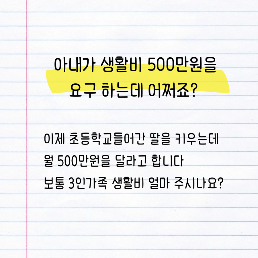 어제는 인터넷에서 이런 글을 봤어요. “아내가 한 달 생활비로 500만 원을 달라고 합니다. 3인 가족이고, 딸은 이제 초등학교에 입학했어요.” 남편은 이 금액이 과하다고 느끼는 듯했고, 많은 사람들이 이 부분에 공감하거나, 반대로 ‘그럴 수도 있다’는 의견을 달았더라고요.