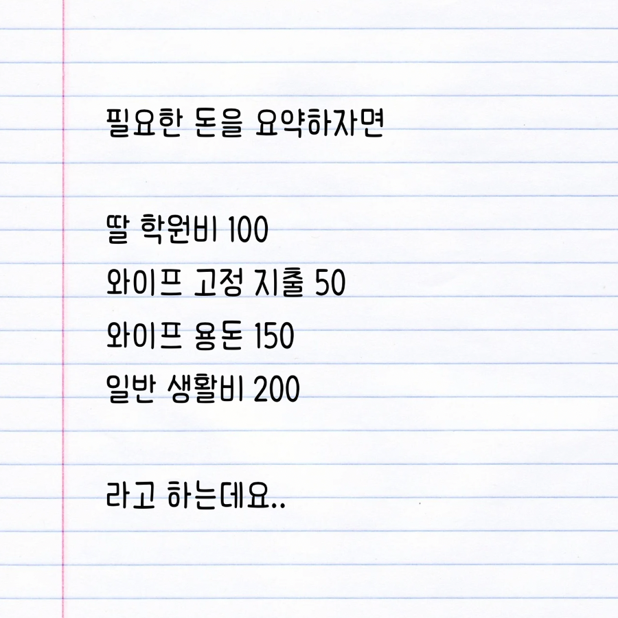게다가 ‘고정 지출’이 따로 있고, 학원비도 별도라면 결국 생활비 구조가 꽤 세분화된 셈인데요. 이렇게 정리된 항목들을 보면 아내가 살림을 아주 못하는 것도 아니고, 나름대로 체계적으로 요구한 것처럼 보이기도 해요.