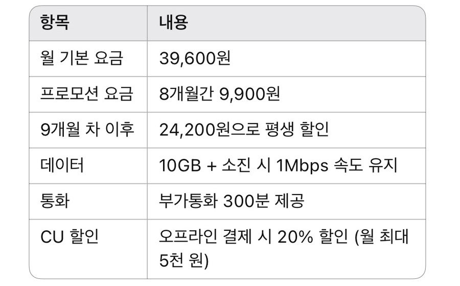 특히 CU 20% 할인은 매달 빼먹지 않고 쓰게 되더라고요.할인 최대치 5천 원까지 꽉 채워 쓰면, 체감 요금은 더 줄어드는 셈이죠. 9개월차 부터는 요금이 24,200원으로 늘지만 약정이 없기때문에 언제든지 저렴한 요금제로 갈아탈 수 있어요.