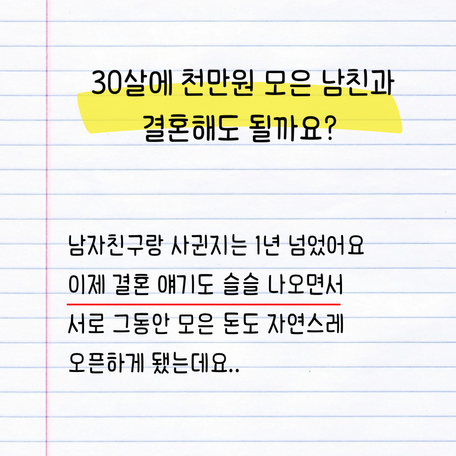 커뮤니티에서 우연히 본글이에요. 사연의 주인공은 연인과 결혼을 진지하게 고민 중인데, 각자 저축한 돈을 확인해보니 상대방의 전 재산이 천만 원이었다고 해요.