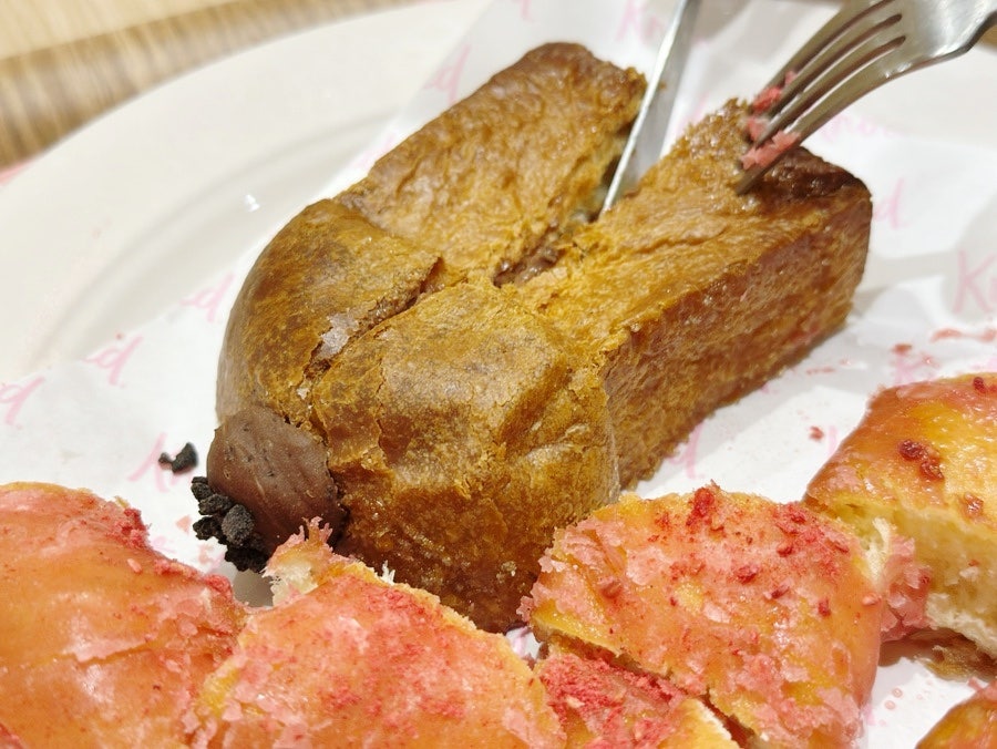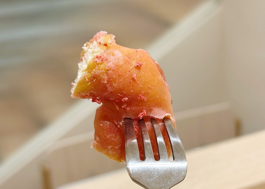 겉은 반짝이는 라즈베리 글레이즈가 감싸고 있었고, 한입 베어무는 순간 입 안에 퍼지는 상콤달콤함이 매력적이었어요. 촉촉하고 부드러운 도넛 반죽과 라즈베리의 산뜻한 조화가 너무 좋았답니다. 달콤한데 텁텁하지 않아서 기분까지 산뜻해지는 맛이에요.