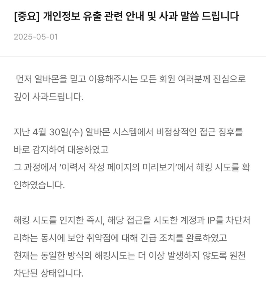 앞으로는 이러한 사고가 반복되지 않도록, 알바몬의 철저한 보안 관리와 사용자의 경각심이 함께 필요합니다. 모두가 안전한 온라인 환경에서 활동할 수 있기를 바랍니다.
