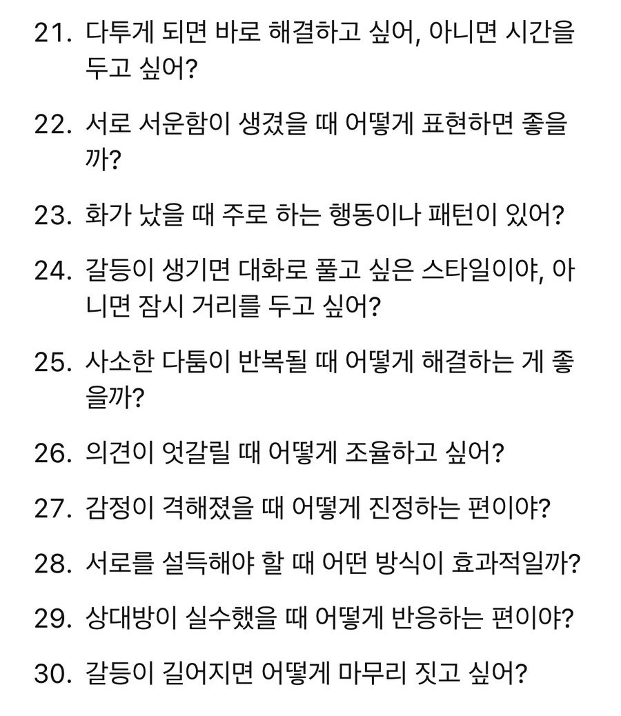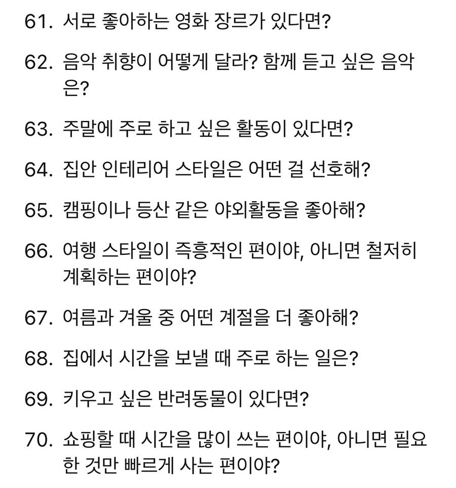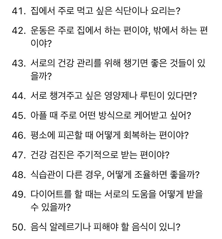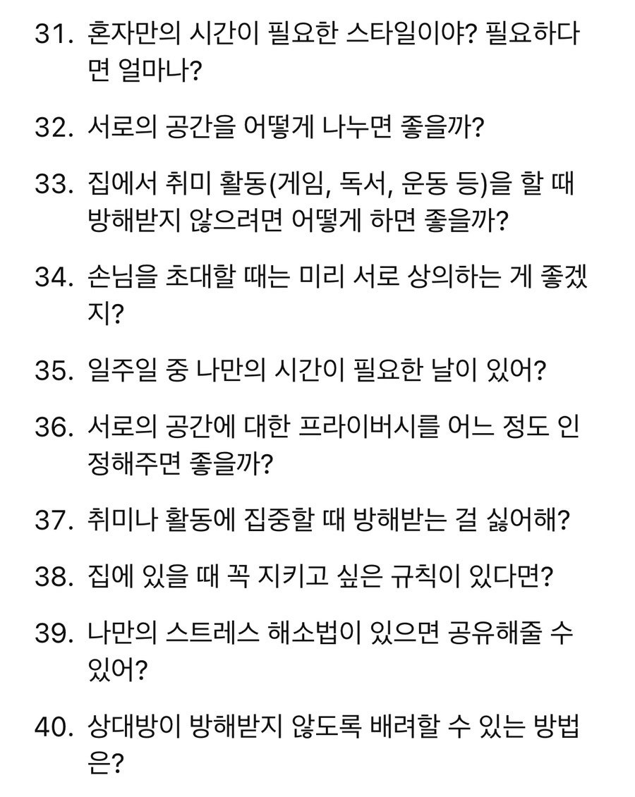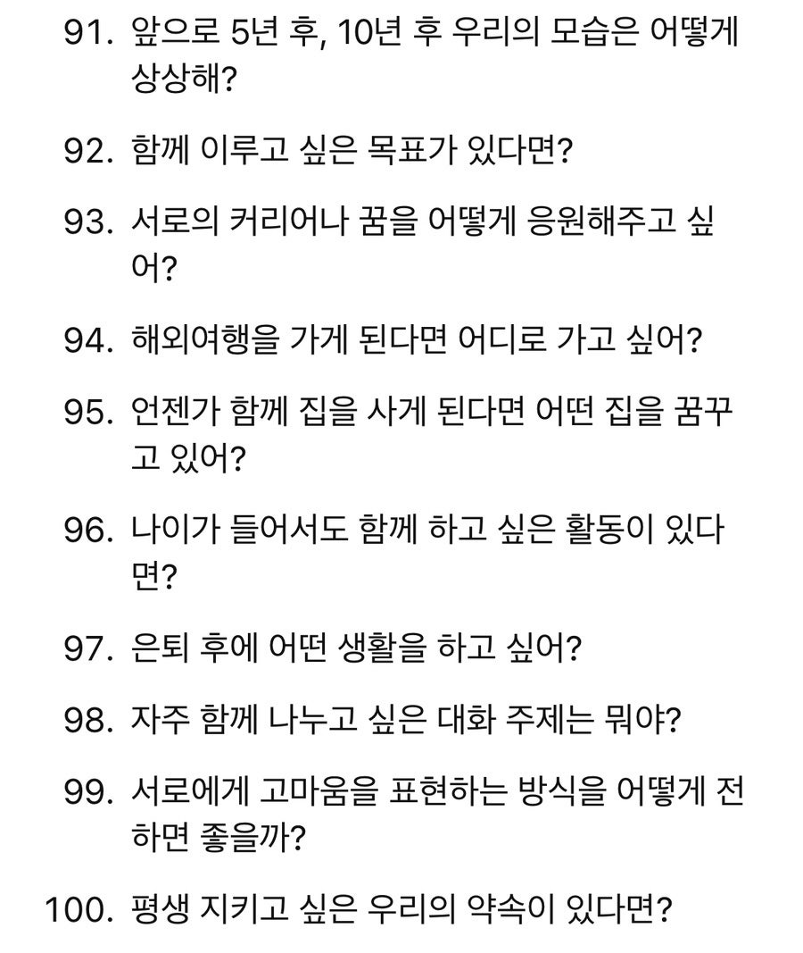 100개의 질문을 나누면서 서로가 얼마나 다른지, 혹은 얼마나 비슷한지 알게 되었어요. 살아보기 전에 미리 이런 부분들을 확인하고 조율하다 보니 불필요한 오해가 줄어들고, 상대방을 더 깊이 이해할 수 있었어요.
