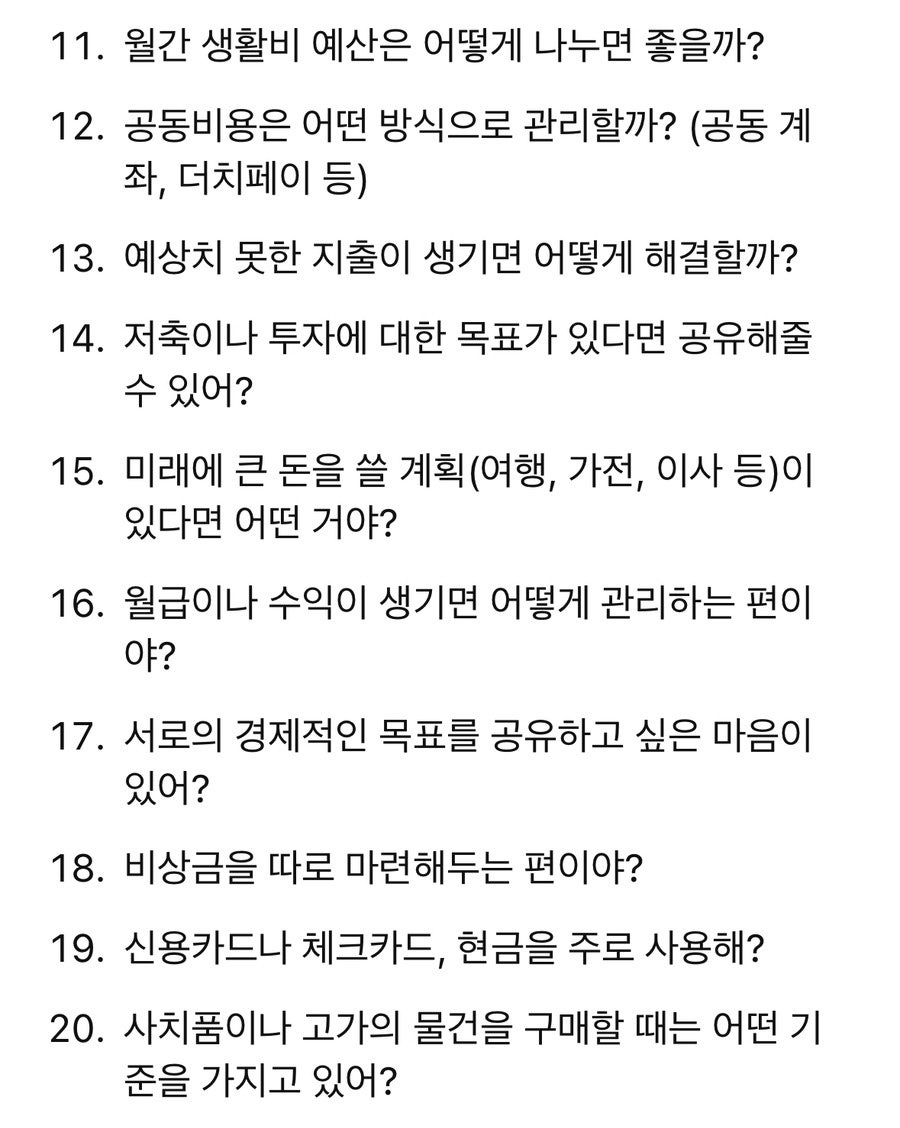 결혼과 동거는 서로를 더욱 알아가는 과정이고, 그 이해가 쌓여서 더 단단한 신뢰가 만들어지더라고요. 만약 결혼을 준비하고 있다면, 이런 대화를 미리 나눠보는 건 정말 좋은 기회가 될 거예요.